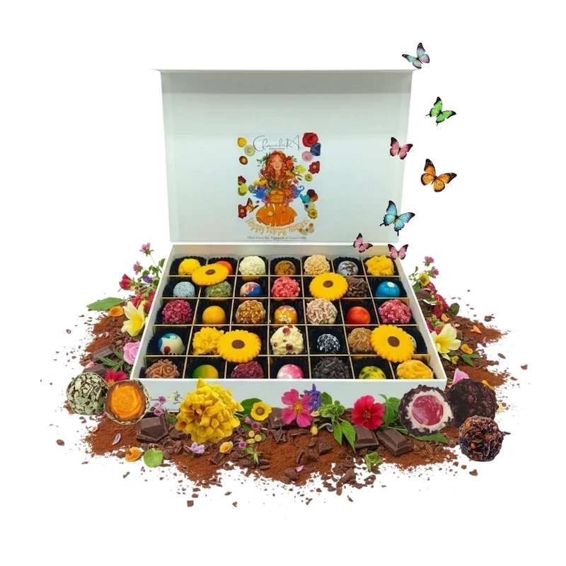 Stap in een wereld van botanische verrassingen. Onze meester-chocolatiers hebben een symfonie gecomponeerd van bloemige extracten en fris fruit. Denk aan de verfijning van Roos, Orchidee en Saffraan, gedurfd gecombineerd met Framboos, Rabarber en Abrikoos. Elke bonbon is een kleurrijk eerbetoon aan de natuur, handgemaakt en gedecoreerd.