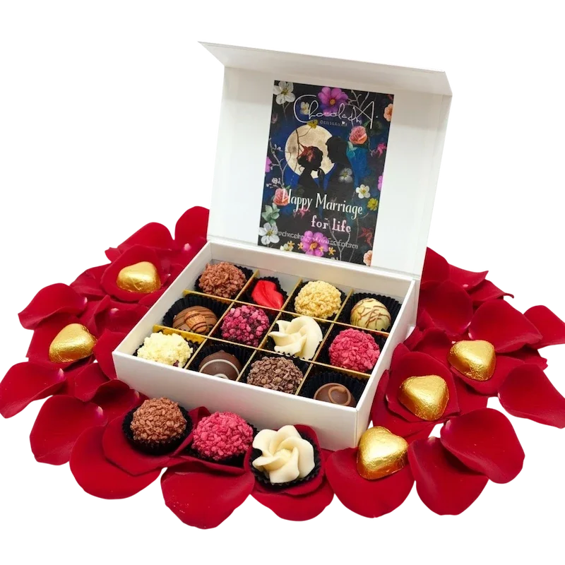Deze bruidsbox is niet alleen een lust voor het oog, maar ook een ware smaaksensatie. Onze handgemaakte chocoladetruffels en marsepeinen rozen zijn gemaakt van de beste ingrediënten en met veel liefde bereid.
