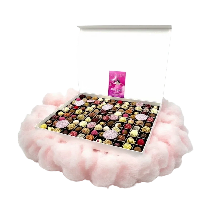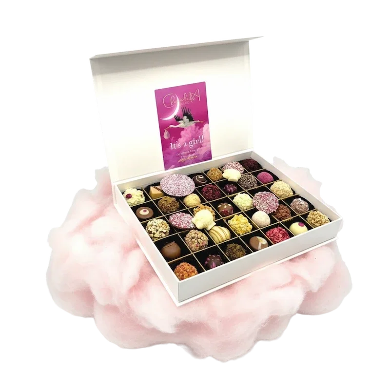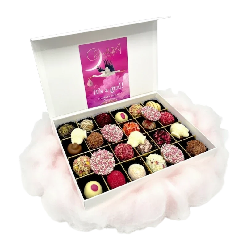 Is er een lief klein meisje geboren? Verras de trotse ouders met een uniek en smaakvol geboortecadeau: onze exclusieve chocoladebox voor meisjes! Deze prachtige box is gevuld met heerlijke handgemaakte chocolade, perfect om de komst van hun dochtertje te vieren.