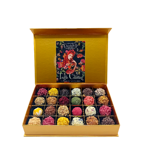 Geniet van een selectie van onze beroemde handgemaakte chocolade truffels en bonbons in deze luxe medium doos. Perfect als cadeau of om jezelf te verwennen met een exclusieve chocolade-ervaring.