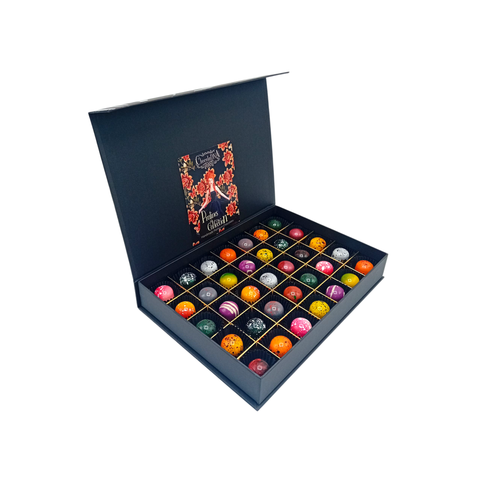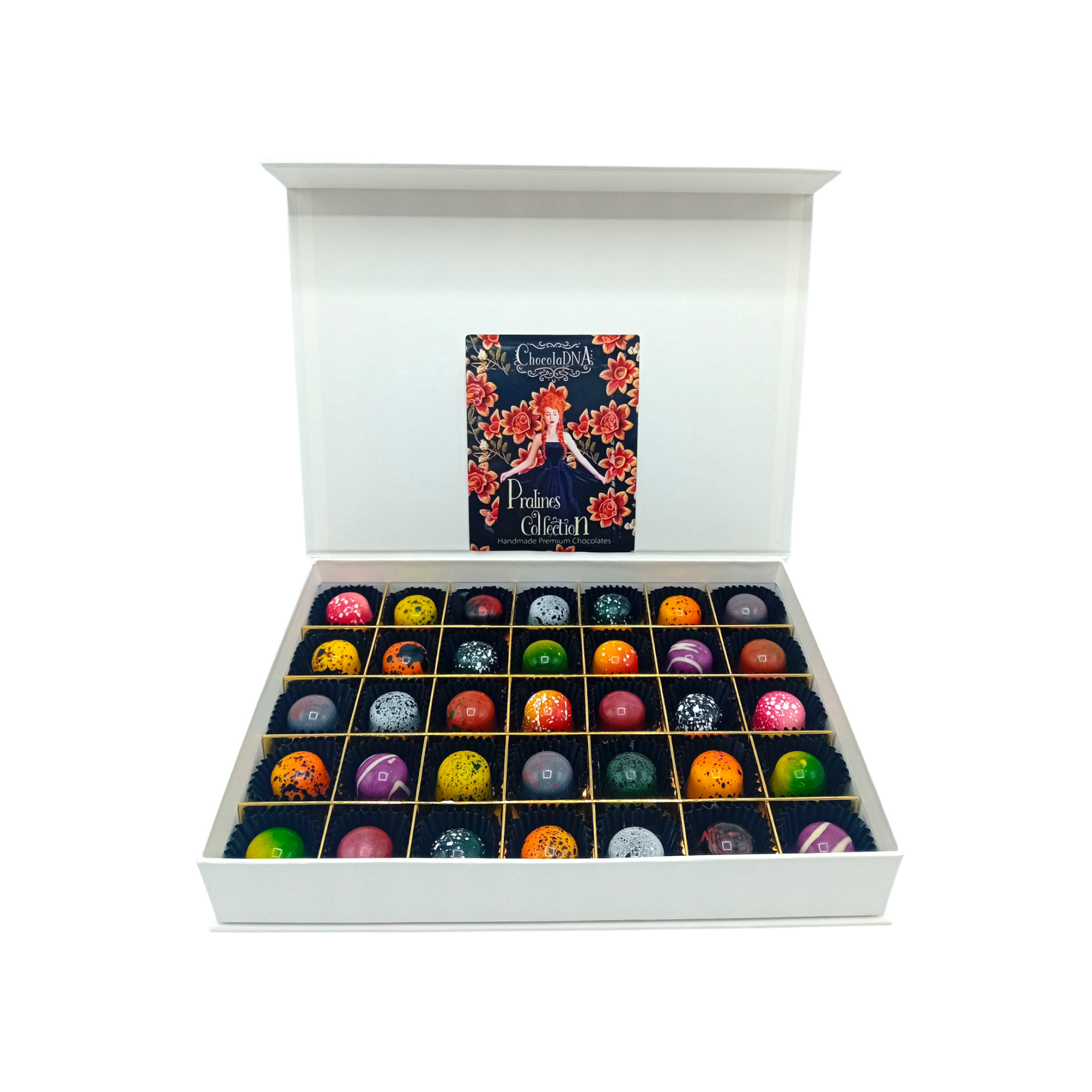 Laat je verrassen door onze kleurrijke box vol ambachtelijke, chocolade heerlijkheden! Deze luxe medium box met magneetsluiting bevat een fantastisch assortiment van 35 Bonbons, een ware traktatie voor de echte chocoladeliefhebber.