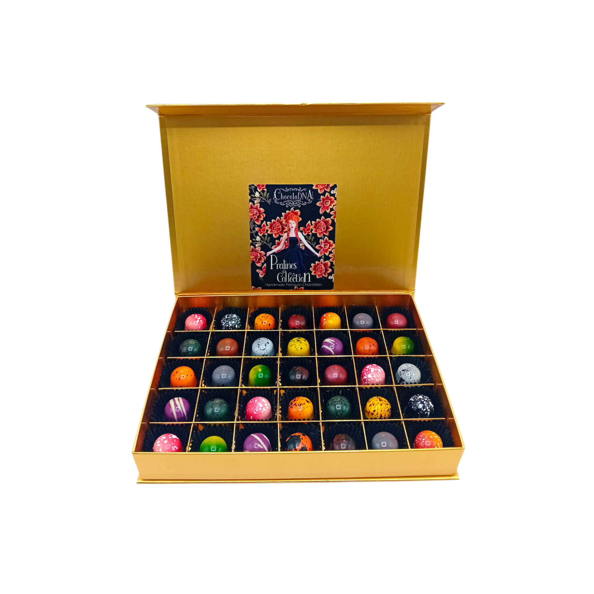 - 35 ambachtelijke pralines: Een kleurrijk en gevarieerd assortiment.