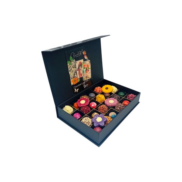 Een liefdevol samengesteld cadeau voor haar, ontworpen als moment van aandacht, waardering en pure verwennerij. Deze elegante chocoladebox is gevuld met handgemaakte Truffels en Bonbons en gecombineerd met een stijlvol poëzie-album vol warme woorden en kleine herinneringen.