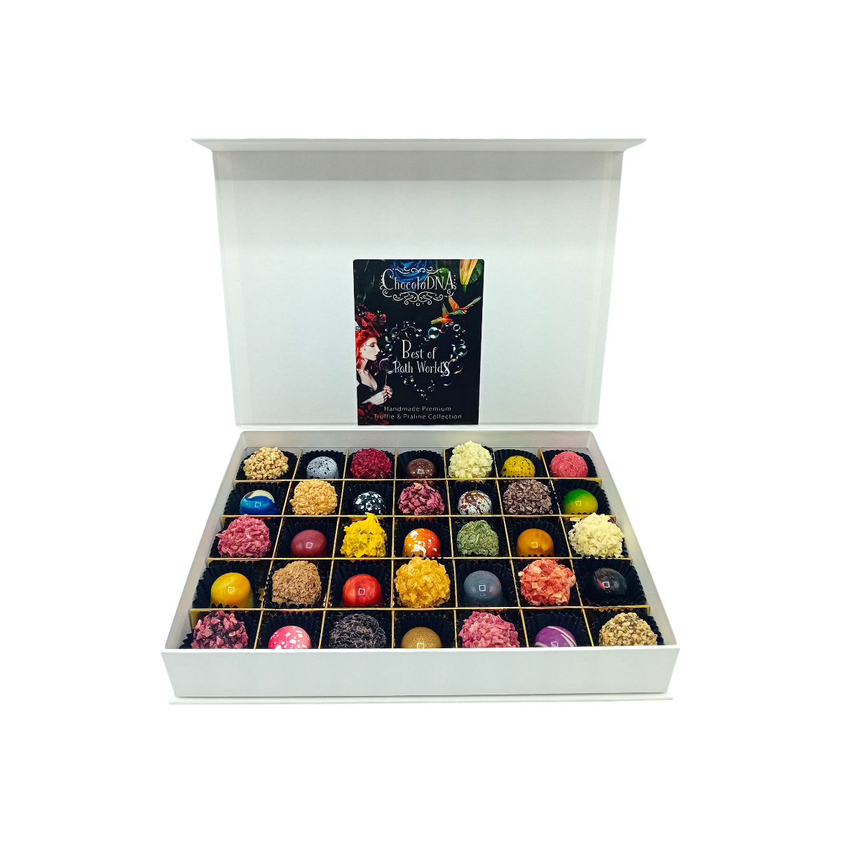 - gevuld met een assortie van 35 mix van handgemaakte truffels en ambachtelijke pralines.