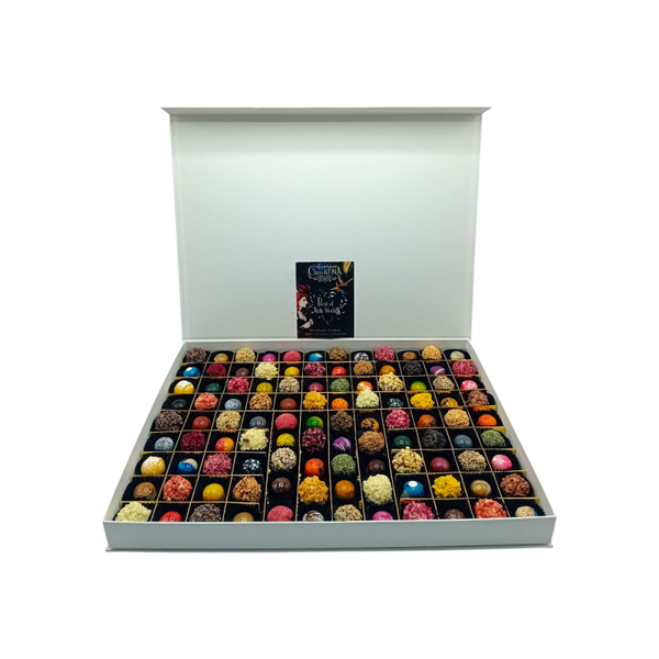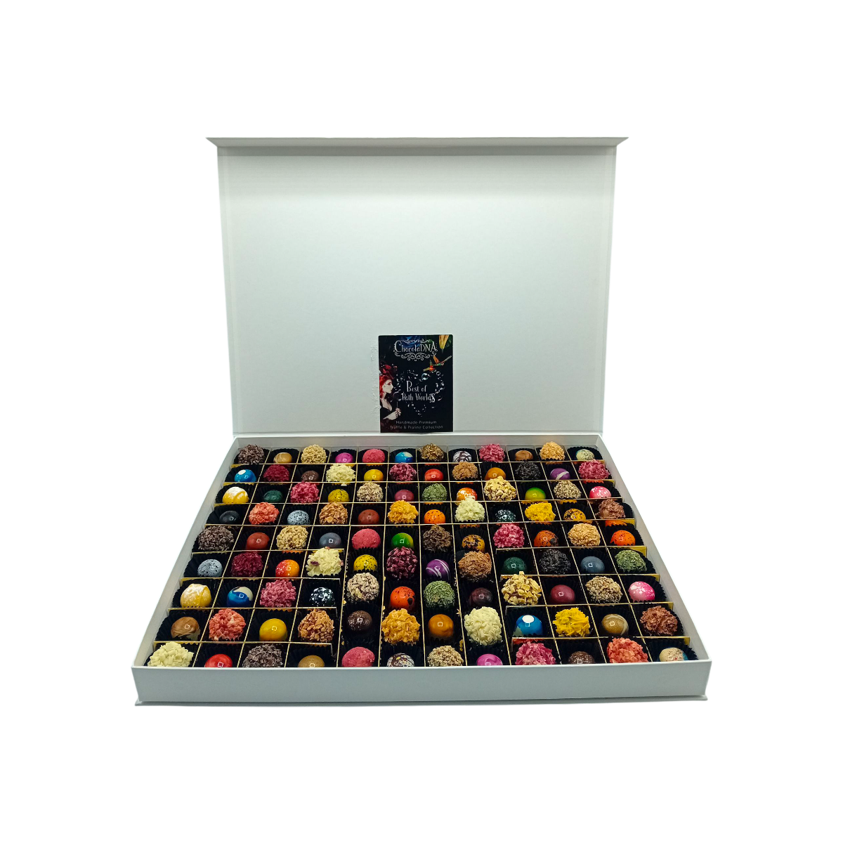 Deze exclusieve chocoladebox is een ware beleving, een rijk gevulde collectie van 108 handgemaakte truffels en ambachtelijke pralines, elk uniek in vorm, kleur en smaak.