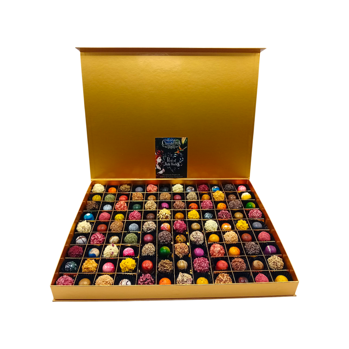 - gevuld met een assortie van 108 mix van handgemaakte truffels en ambachtelijke pralines.