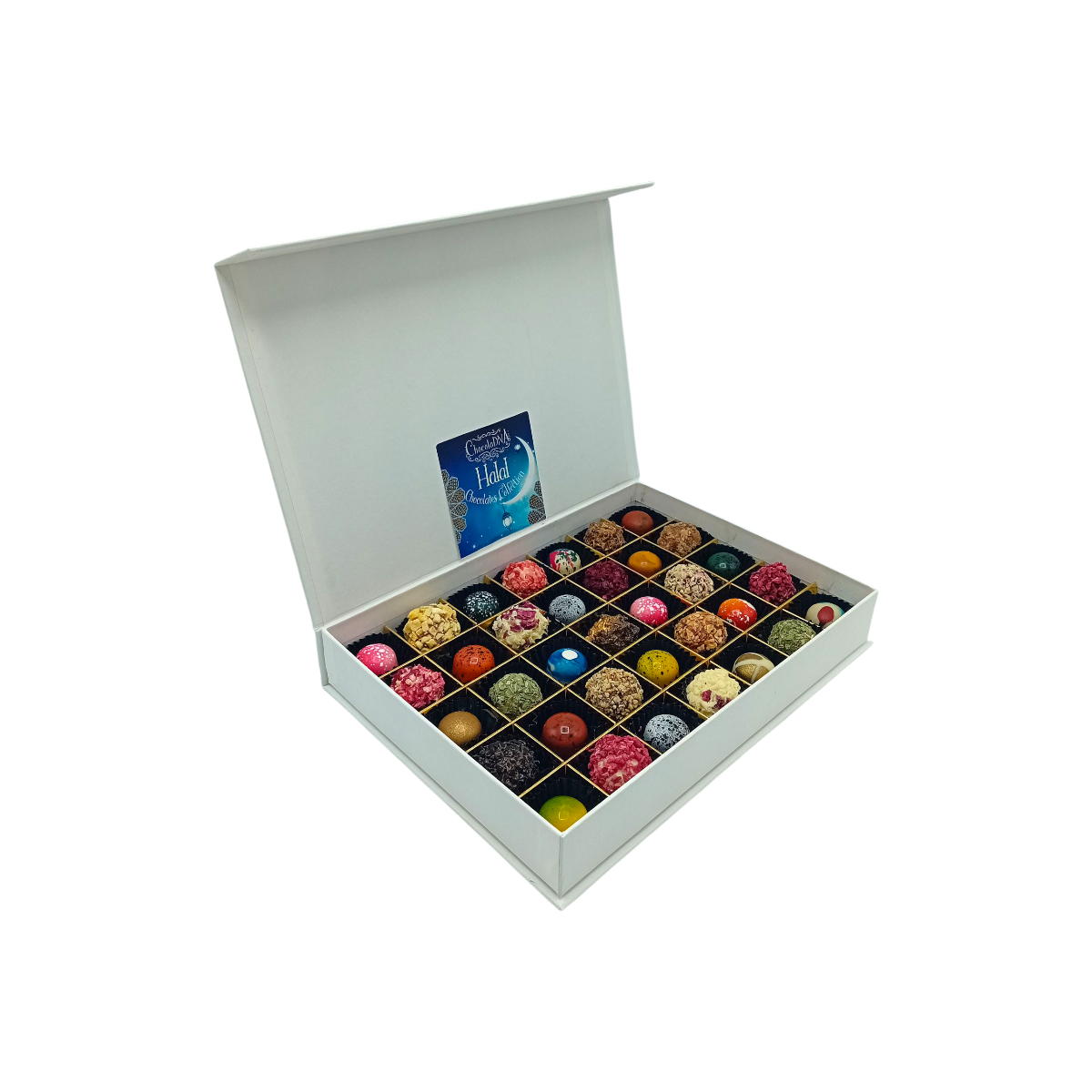 Deze exclusieve chocoladebox bevat een zorgvuldig samengestelde selectie van 35 handgemaakte bonbons, pralines en truffels, volledig halal gecertificeerd. Elk stuk uniek in vorm, kleur en smaak, met precisie gecreëerd door onze beste chocolatiers.