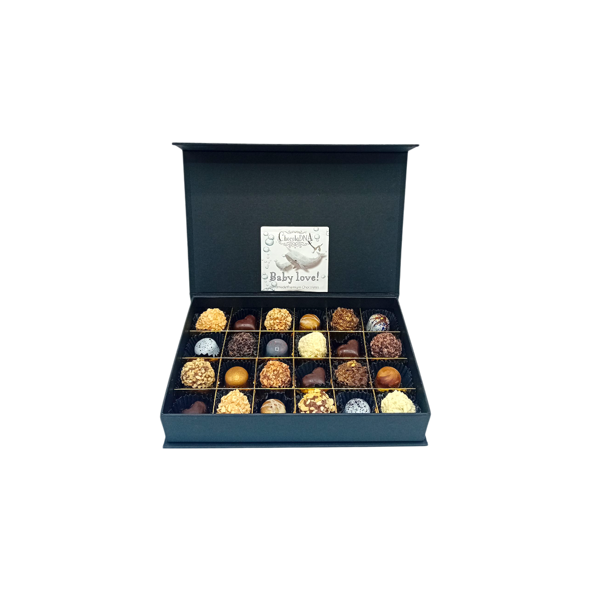 Ontdek onze exclusieve chocoladeverrassingen, perfect voor de komst van een kleintje. Geniet van handgemaakte chocoladetruffels, pralines, en schattige witte chocolade schaapjes, allemaal in een stijlvolle neutrale verpakking.