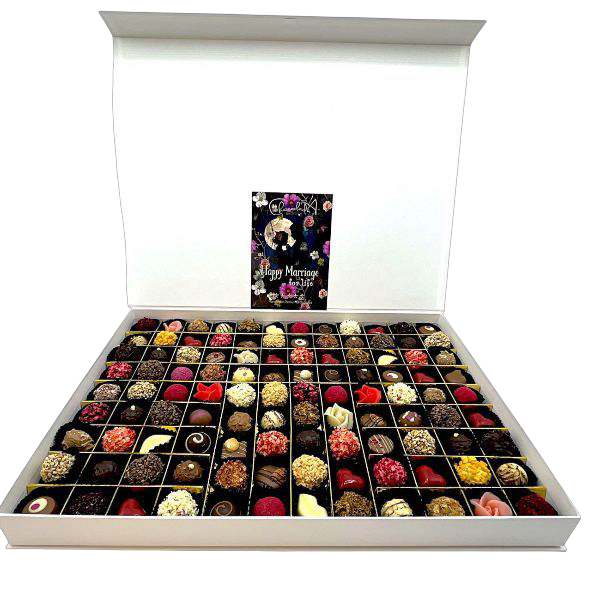 Onze speciale bruids-boxen zijn hiervoor ideaal, met een assortiment van handgemaakte chocoladetruffels, marsepeinen rozen.