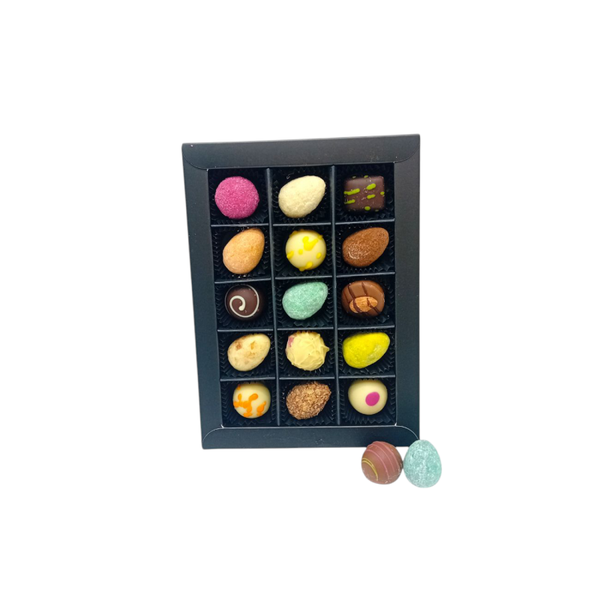 - doorzichtig doosje met een mix van 15 handgemaakte chocolade eitjes en bonbons