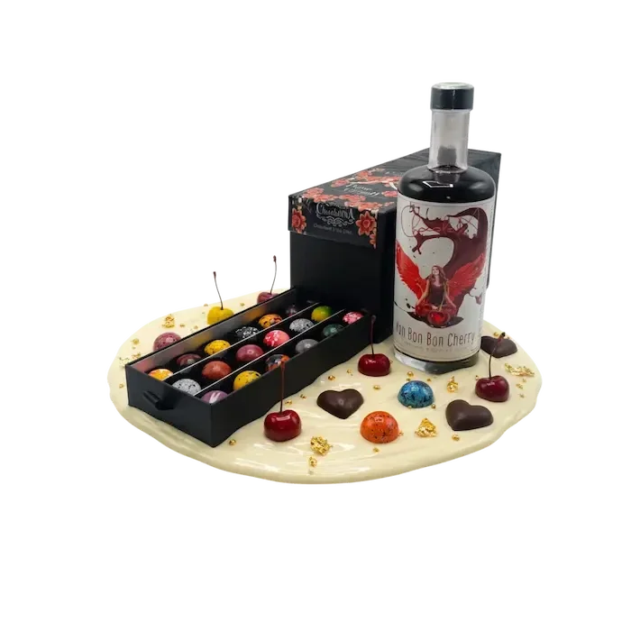 Onder de likeur opent zich een elegante lade, gevuld met een zorgvuldig samengestelde selectie van 30 handgemaakte truffels en bonbons, perfect afgestemd op de rijke kersen- en chocoladetonen van de likeur.