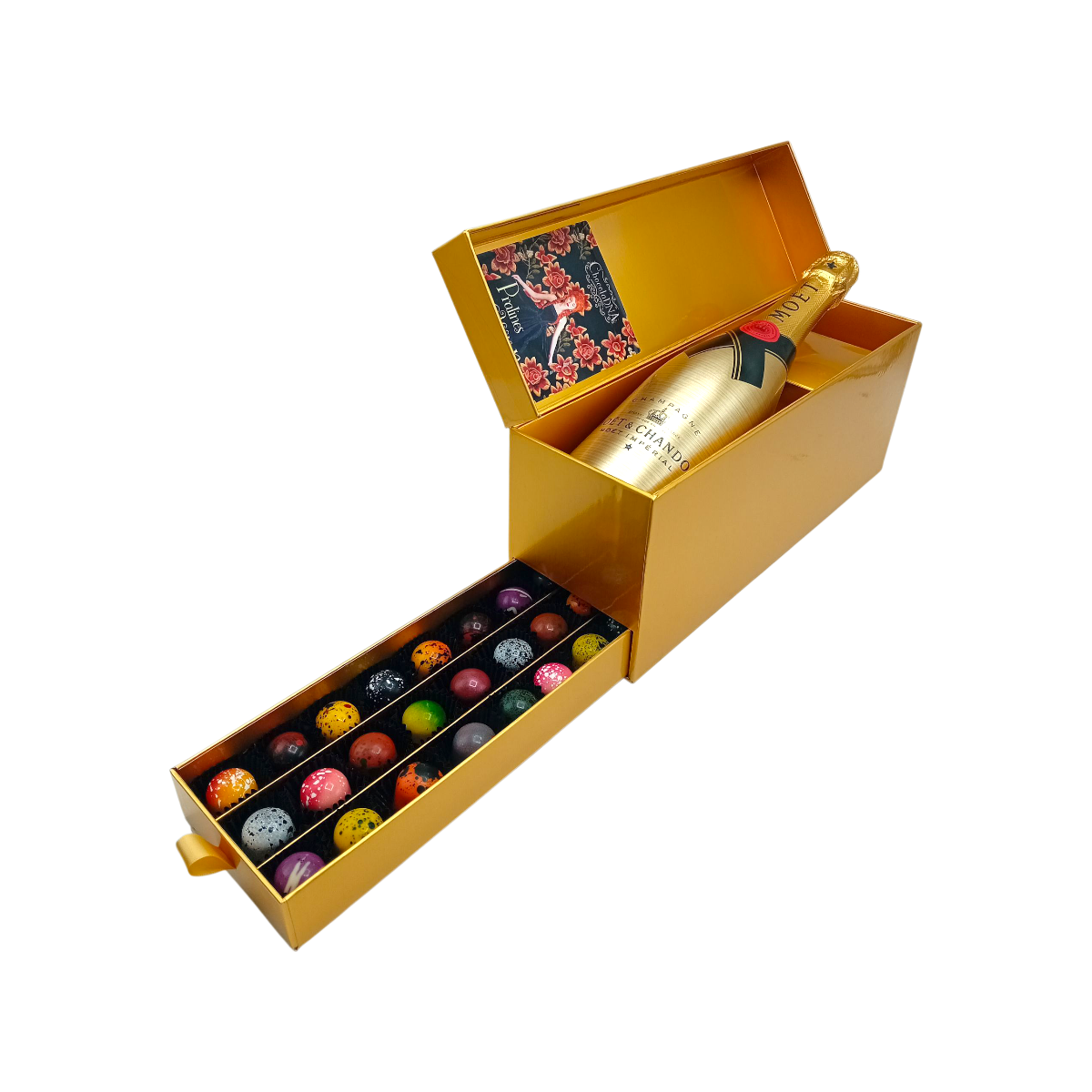 Ladebox met Chocolade Pralines en Fles Moët Champange