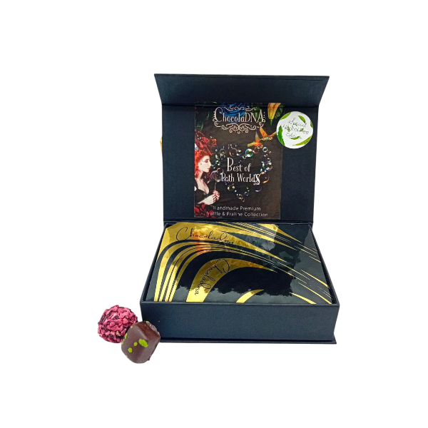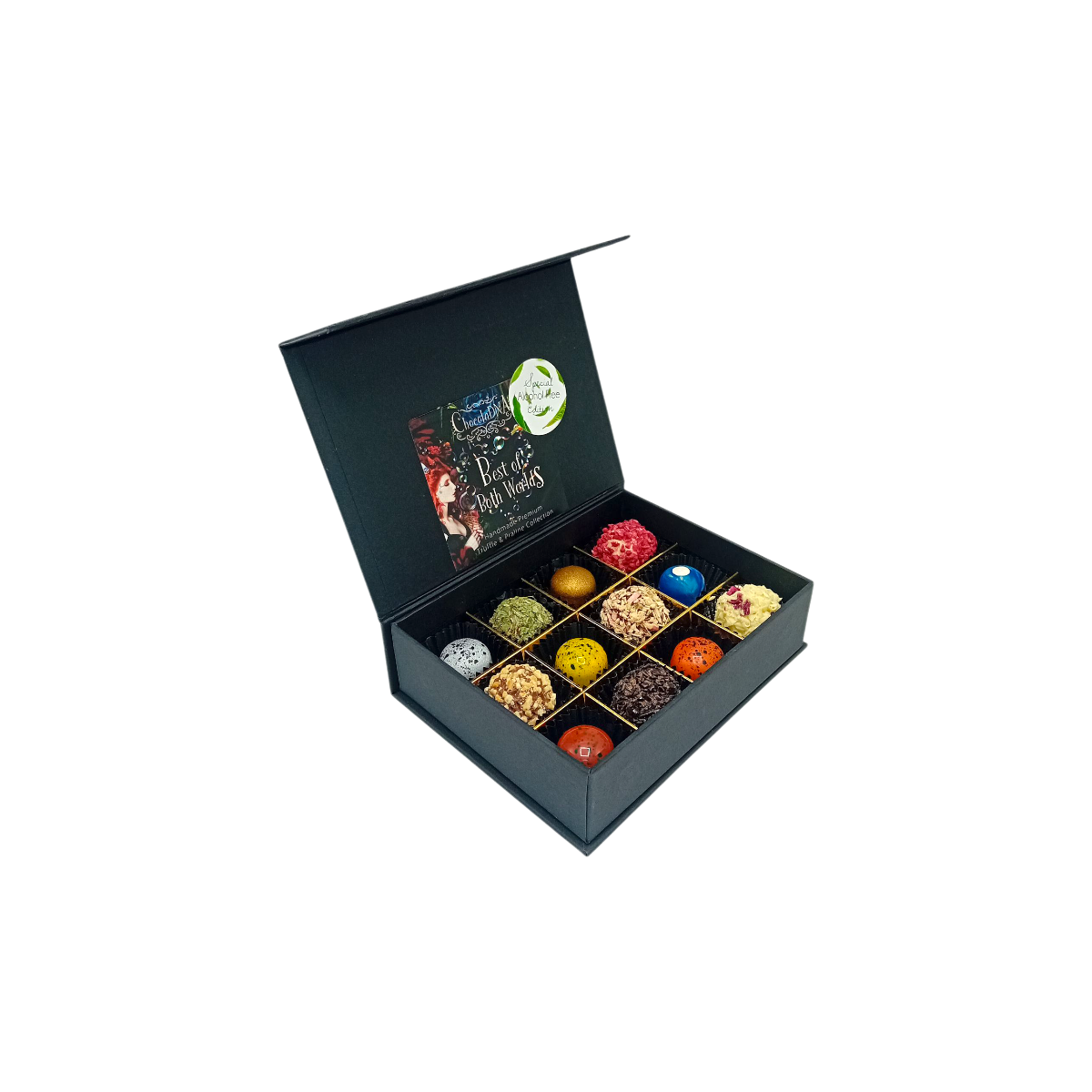 - gevuld met een assortie van 12 mix van handgemaakte Alcoholvrije truffels en ambachtelijke pralines.