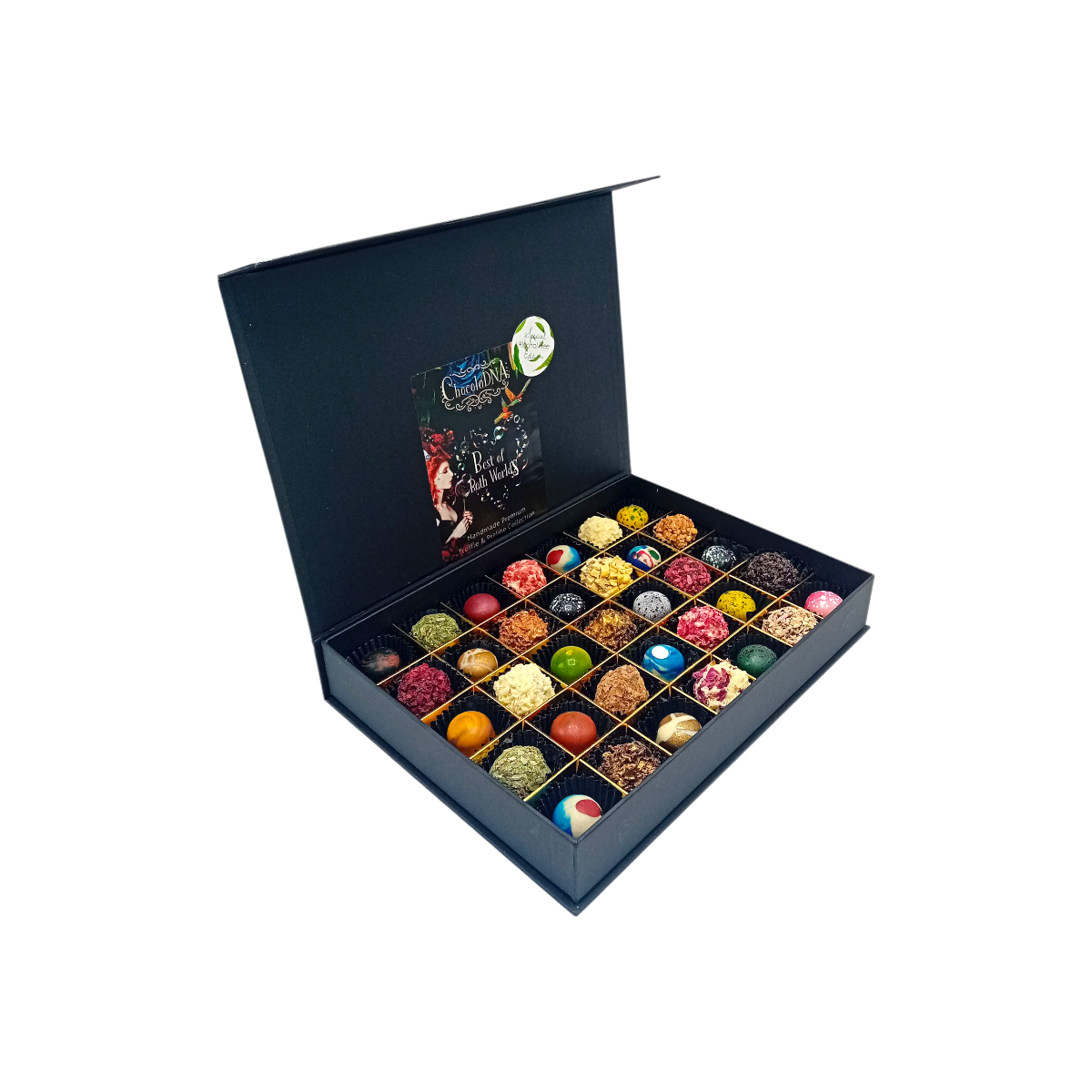 - gevuld met een assortie van 35 mix van handgemaakte Alcoholvrije truffels en ambachtelijke pralines.