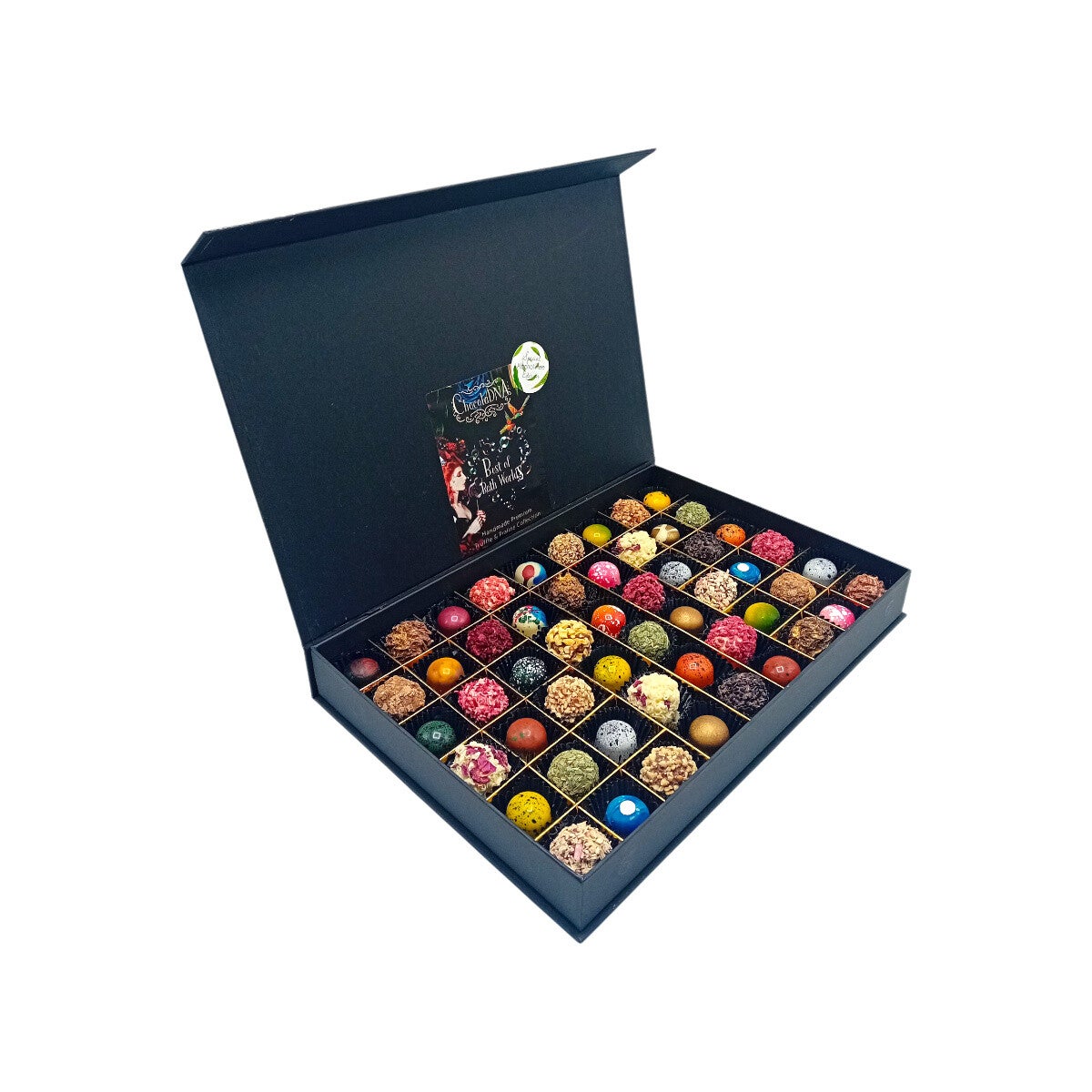 - gevuld met een assortie van 54 mix van handgemaakte Alcoholvrije truffels en ambachtelijke pralines.