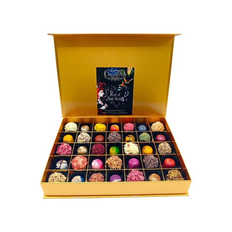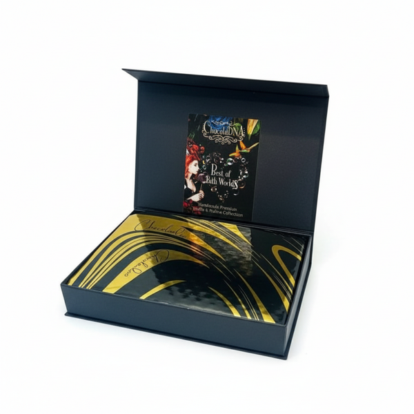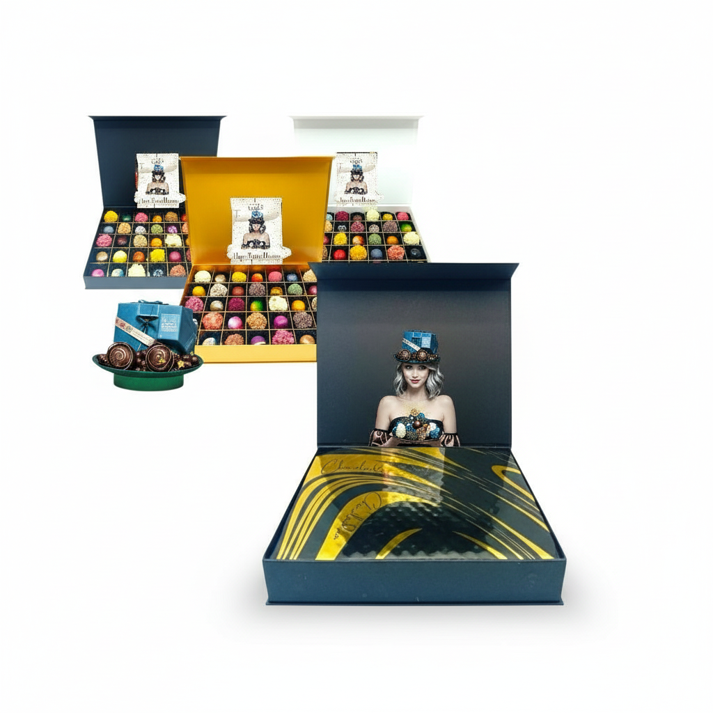 Onze mix-dozen zijn meer dan chocolade alleen; het zijn met de hand samengestelde kunstwerkjes. Verpakt in een schitterende giftbox met magneetdeksel — naar keuze in goud, zwart of wit — geef je een geschenk dat luxe uitstraalt vanaf het eerste moment.